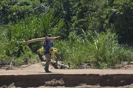 אחרי שלוש שעות שבהם הורדנו 8 עצים, 2 לכל בן אדם, אנחנו מזרימים את העצים במורד הנהר הרדוד עד לחיבור עם נהר הטואיצ'י שם אנחנו מעלים את בולי העץ אל החוף האחרון מספר מטרים מהנהר ובזמן הזה חוסה דאג להתרוצץ בג'ונגל ולהביא לנו חבל שהוא מכין מעץ דקל, לא להאמין שכל זה נמצא בטבע.