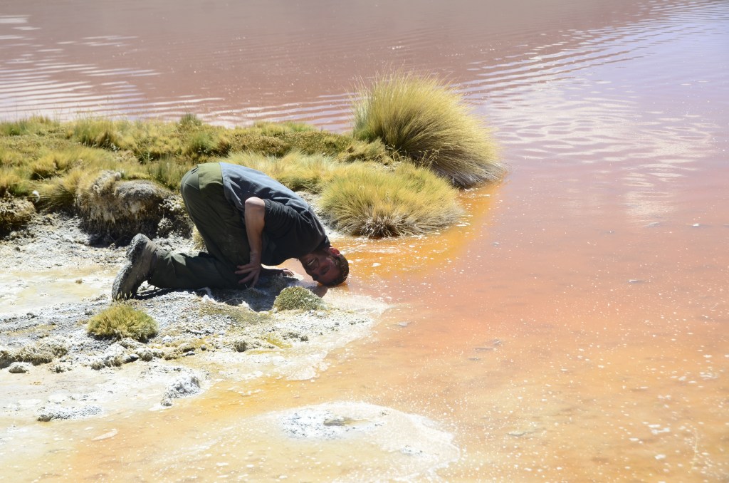 מהגייזרים אנחנו ממשיכים במסלול התיירותי ומגיעים אל הלגונה קולורדה, שהיא הלגונה האדומה, מקום יפה שמקבל גוון מעניין משילוב של פלמנגוים והמים האדומים כתומים, ואני מנצל את הרגע לתמונה משעשעת שמשווה בין צבע המים לצבע השיער שלי.