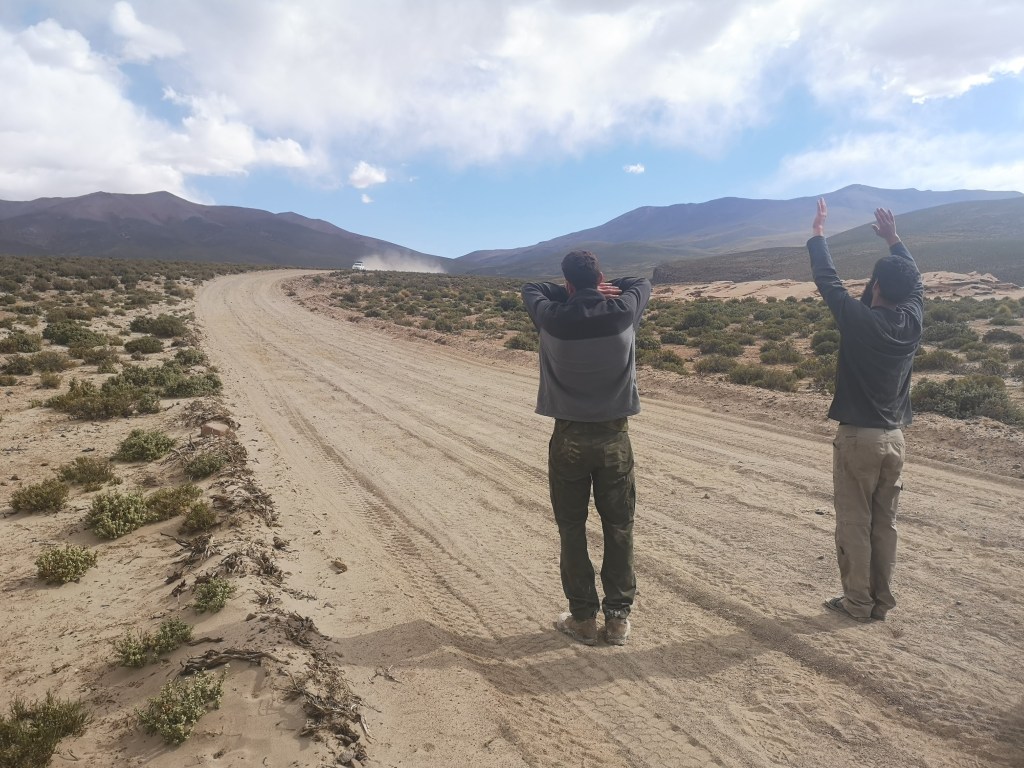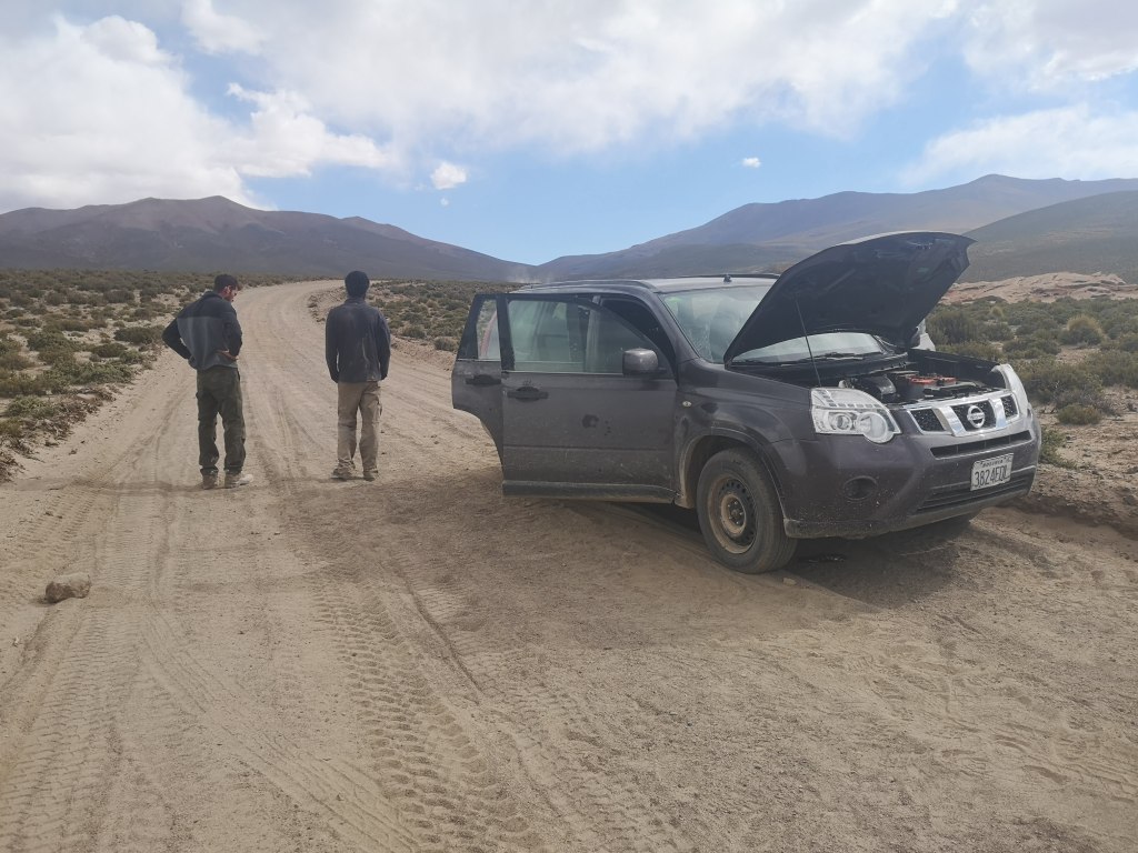 החברים מתעוררים, חוזרים לג'יפ, היום בתוכנית יש לנו את האטרקציות המרכזיות של הפארק, מה שגם הסיורים המאורגנים עושים, היעד הראשון הוא הגייזרים באתר סול דה מניינה, בדרך לשם המאפס מי מבלבל אותנו בדרך ואנחנו מגיעים לשער ברזל עם בוטקה לידו, אנחנו קצת מופתעים אבל חושבים שזו נקודת ביקורת של משרד התיירות הבוליביאני, אף אחד לא ניגש אלינו ואנחנו יוצאים לראות מה הסיפור, למרה הפתעתנו הבותקה פתוח, ואנחנו רואים מפתחות זרוקים על השולחן, הטיול הזה כבר ממזמן הפסיק להפתיע אותנו ואנחנו לוקחים את המפתחות ופותחים לעצמנו את השער.